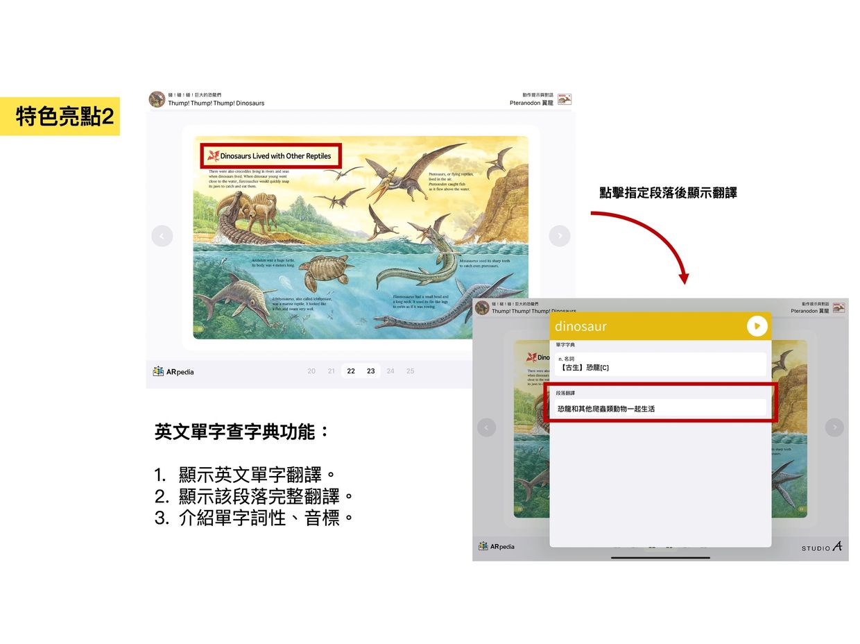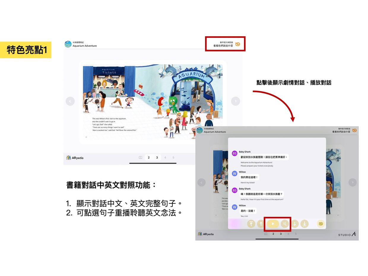 ARpedia 提供全英文互動式繪本,配合使用導讀App,協助師生、家長更深入了解內容,同時提供動作操作說明,透過雙語導讀互動教學,提高與小朋友的共學效率。